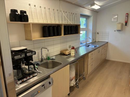 Pletten råder over et veludstyret køkken med service, køleskab, komfur, opvaskemaskine og alt, hvad du skal bruge for at lave mad eller servere catering.